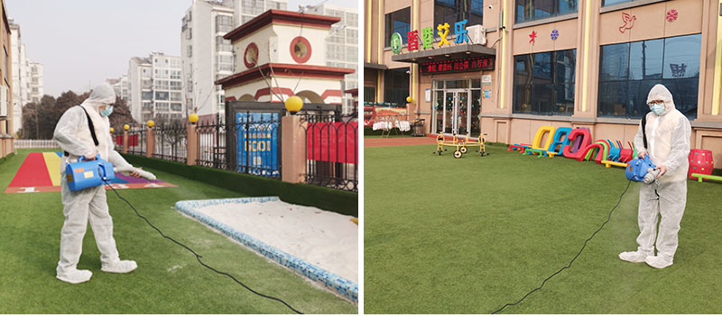 為了此次活動,海拓集團(tuán)特別提供了一臺背包式靜電噴霧器、一臺風(fēng)送多功能靜電噴霧器、兩臺超低容量手持冷霧機,并且嚴(yán)格按照藥劑配比和消毒流程進(jìn)行消毒工作。工作人員身穿防護(hù)服,手持彌霧機,對校園內(nèi)廣場、游戲設(shè)施、道路、樓梯、走廊、教室、衛(wèi)生間、宿舍等場所進(jìn)行全面消毒,不留死角,不留盲區(qū),為孩子們創(chuàng)造安全、衛(wèi)生、整潔、明亮的校園環(huán)境。