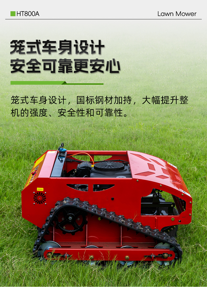 HT800A遙控割草機籠式車身設(shè)計,國標(biāo)鋼材加持,大幅提升整機的強度、安全性和可靠性。