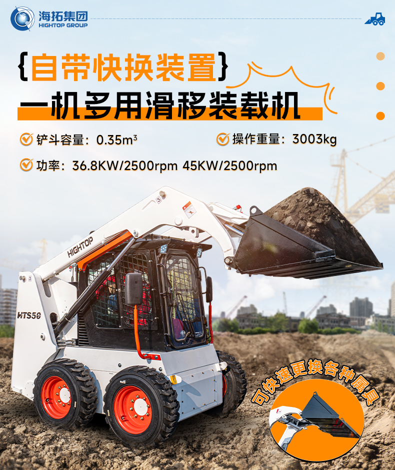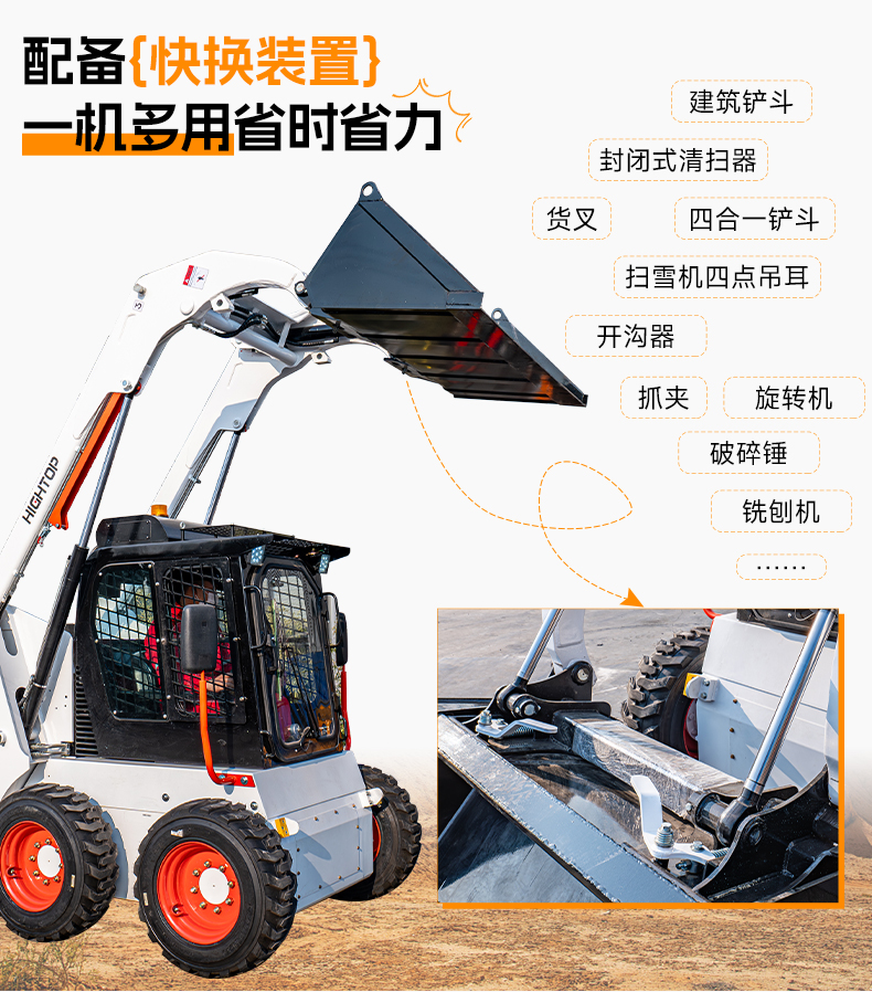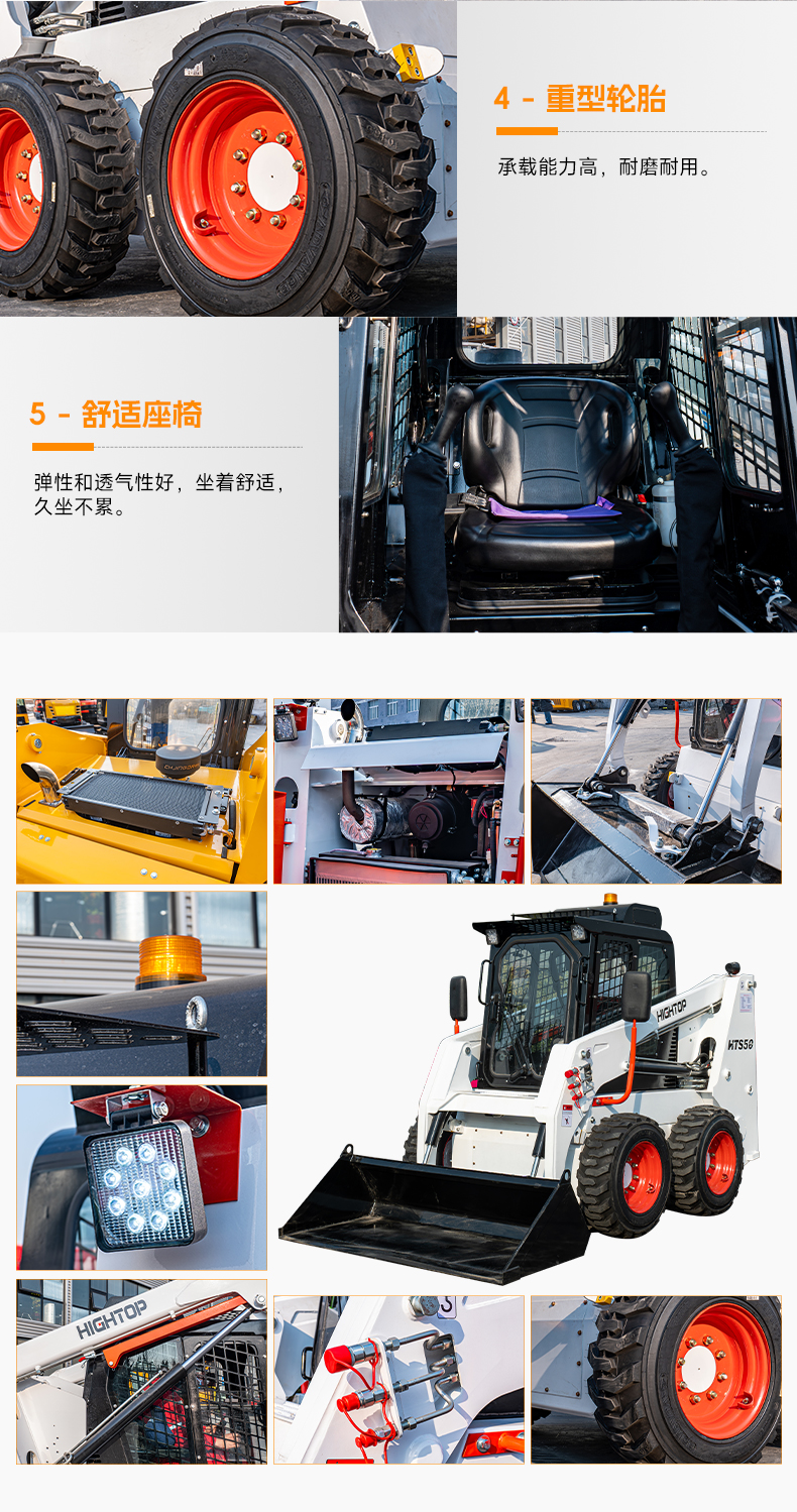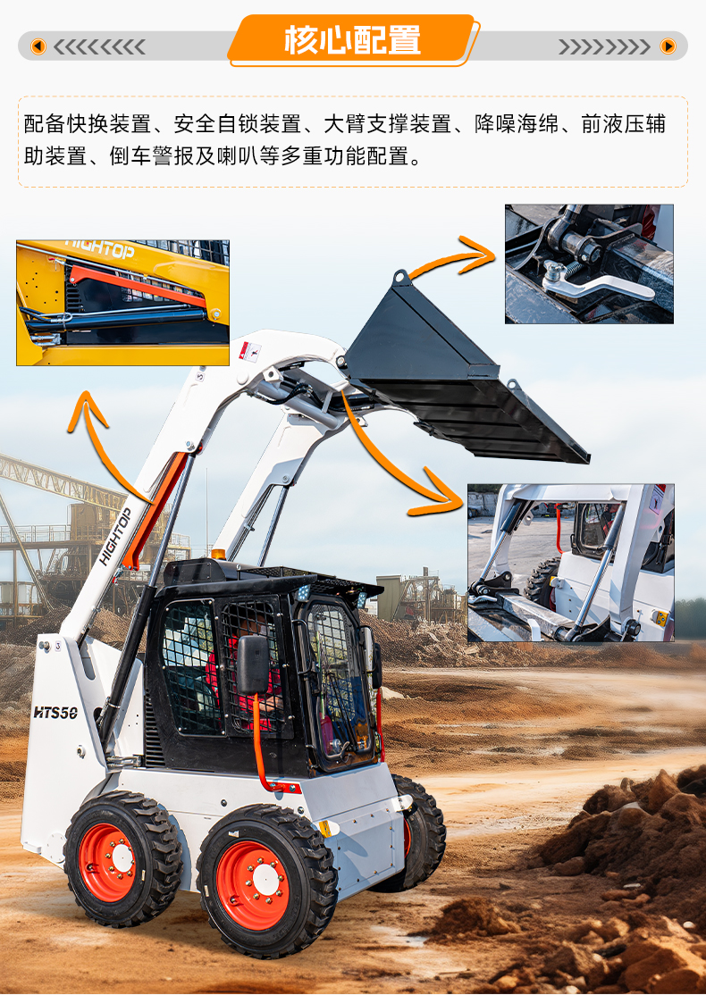 HTS50滑移裝載機(jī)配備快換裝置、安全自鎖裝置、大臂支撐裝置、降噪海綿、前液壓輔助裝置、倒車警報(bào)及喇叭等多重功能配置。