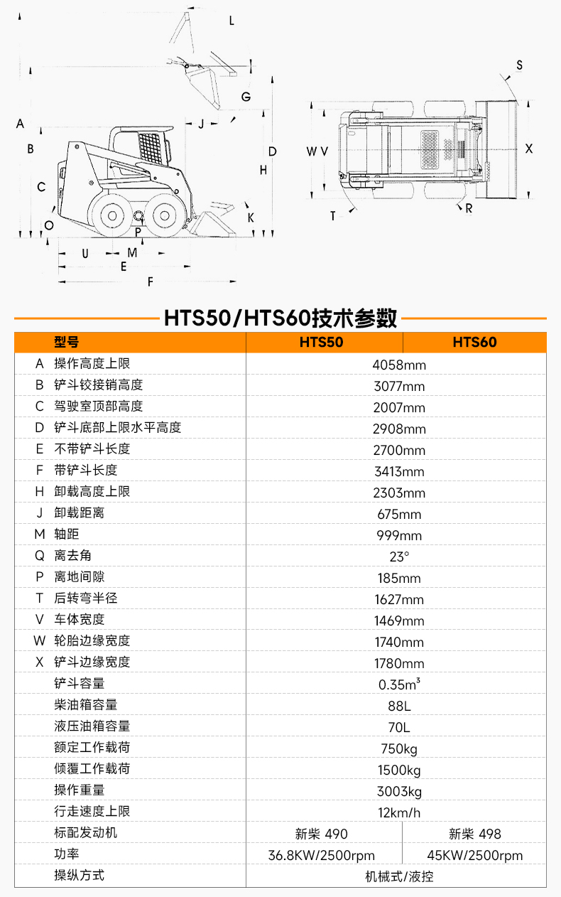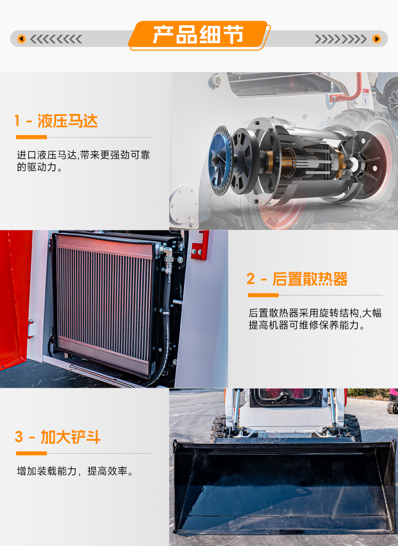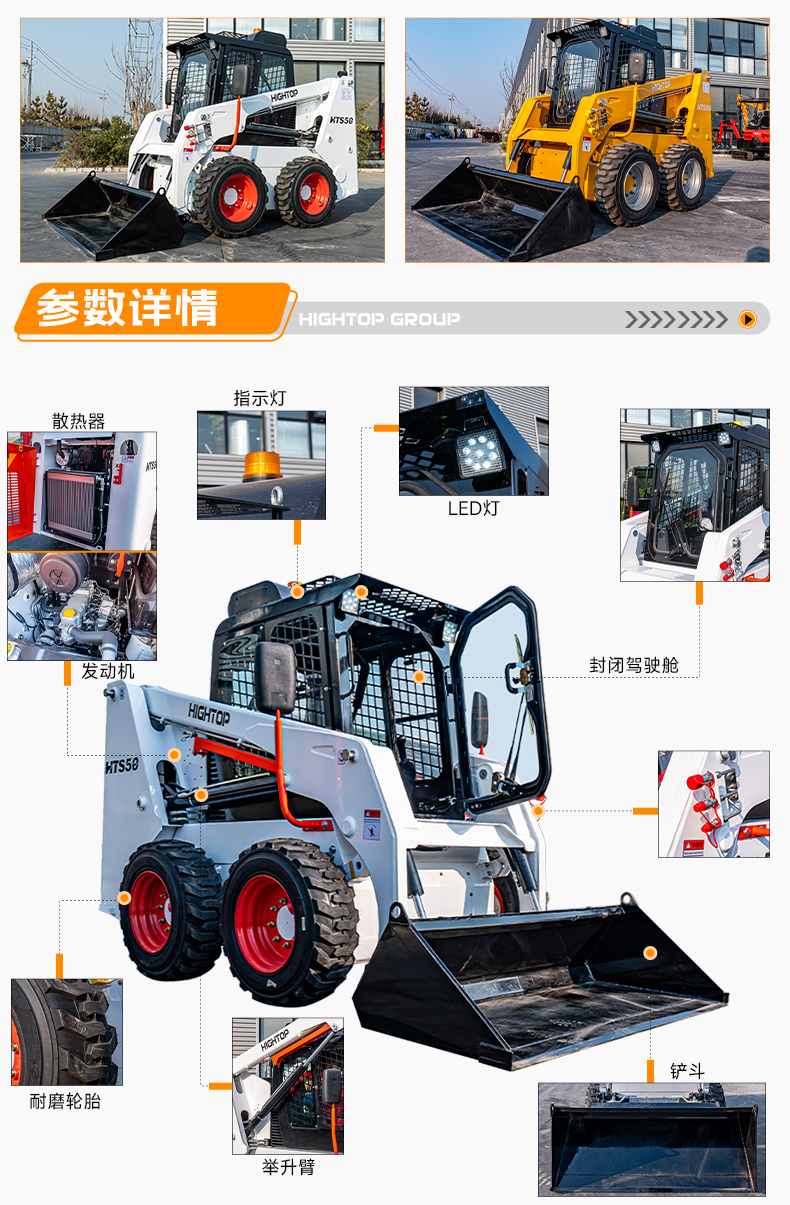 HTS50滑移裝載機(jī)配備快換裝置、安全自鎖裝置、大臂支撐裝置、降噪海綿、前液壓輔助裝置、倒車警報(bào)及喇叭等多重功能配置。