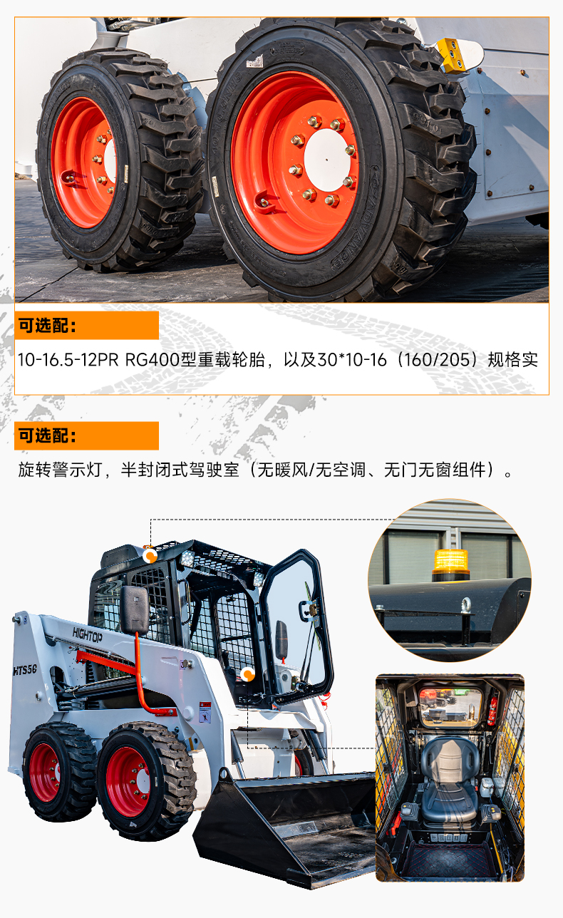 4,可選配10-16.5-12PR RG400型重載輪胎,以及30*10-16(160/205)規(guī)格實(shí)芯輪胎;旋轉(zhuǎn)警示燈,半封閉式駕駛室(無暖風(fēng)/無空調(diào)、無門無窗組件)
